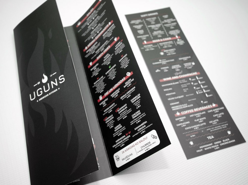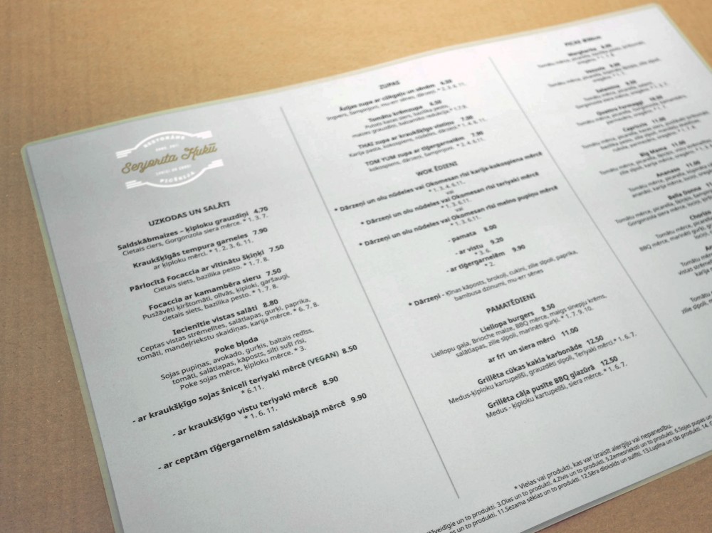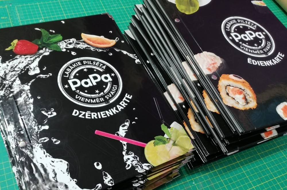 Piedāvājam augstas kvalitātes ēdienkaršu un dzērienkaršu izgatavošanu, kas apvieno stilīgu dizainu ar maksimālu funkcionalitāti. Drukājam uz bieza papīra vai plastikāta materiāliem nodrošinot, ka kartes būs izturīgas pret nolietojumu. Savukārt laminētas virsmas pasargās tās no mitruma un traipiem.